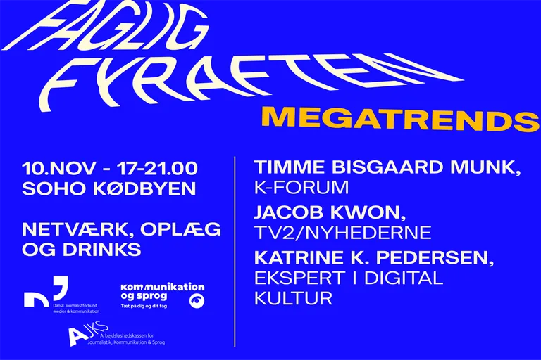 Afsættet for denne Faglige Fyraften er: Megatrends – hvad sætter dagsordenen inden for nyhedsdækning, hvilke tendenser ser man inden for kommunikationsområdet og hvad er temperaturen på den digitale kultur, der indkapsler vores liv i større og større grad?